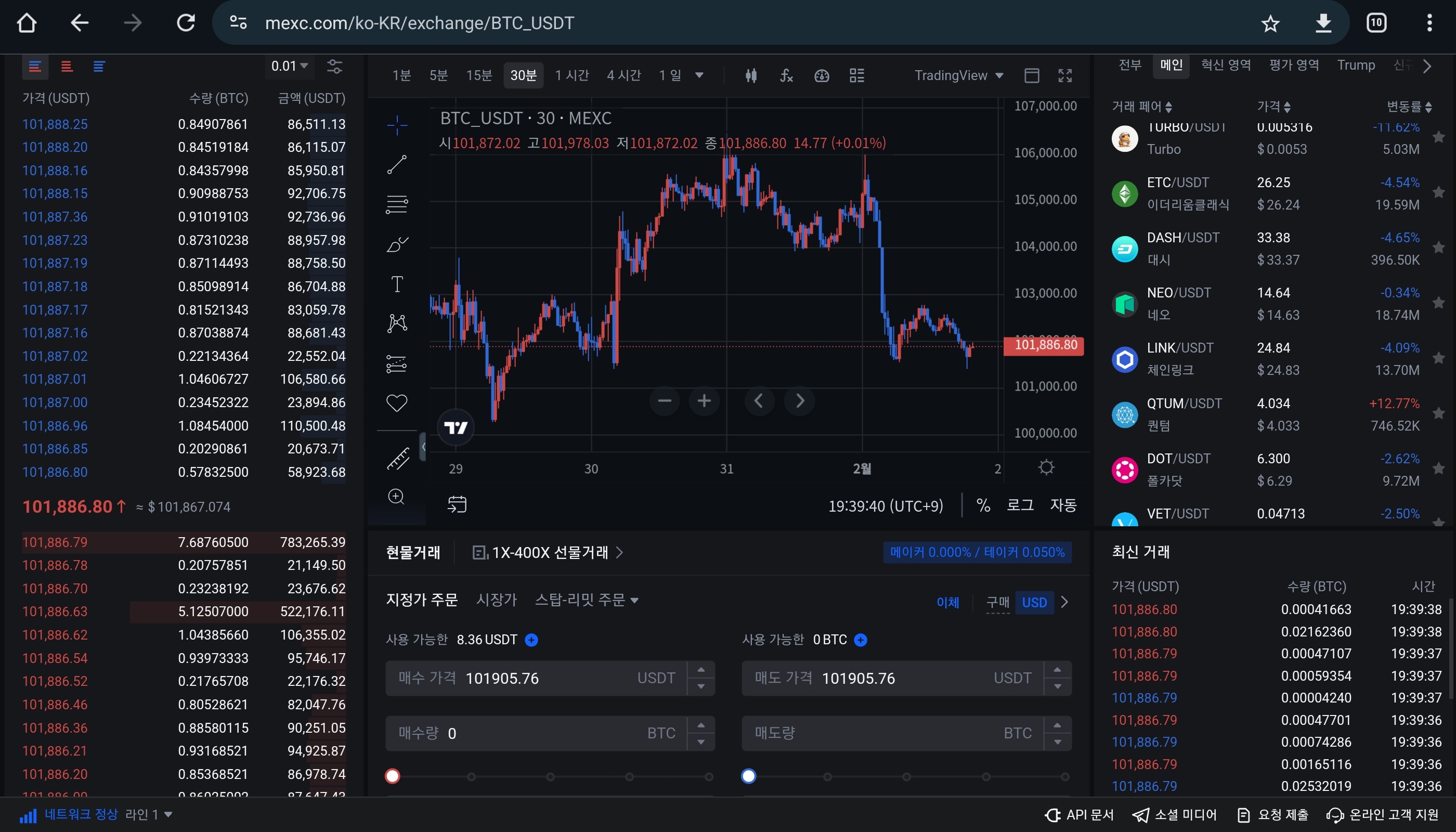 오늘도 조금 해볼까 하고 켰습니다. 수수료 없는거 정말 좋네요. x30 레버리지로 하니까 수수료가 진짜 어마무시 할텐데 무료라니! 말도 많고 탈도 많은 거래소지만..! MEXC 좋습니다 겁나 사고 팔았습니다....jpg ​ ​ 그래서 오늘 손익은...? ​ ... ... .. ... ​ 포지션 내역이구요.. 오늘도 한번 손절 했습니다 ​ ​ ​ 후... 좋았습니다... ( 낮에 매매를 조금 해서 저번 게시물이랑 시작 금액이 조금 다르네요 ) ​ ​ ( * 전 게시물 참조 ) 금일 정산 >> 510.1124 -> 527.8984 ( + 3.49% ) ​ ​ ​ + 추가 ​ 새벽에 거래를 조금 더해서 이득을 봤습니다. 저 첫 번째 거래 내역,,, 1BTC 가량 거래했던 포지션인데... 약 1시간 10분 넘게..