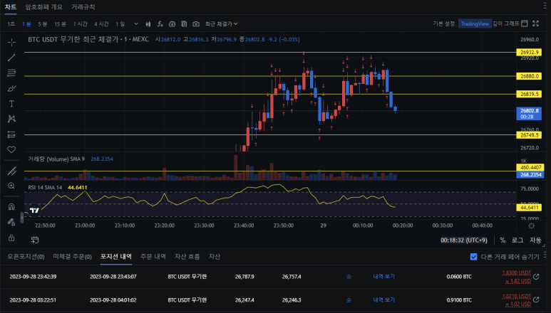 극한의 분단위 단타를 진행할 생각이기 때문에 수수료가 저렴한 MEXC 거래소를 이용하려고합니다. ​ 링크 이용하시면 제가 수수료 페이백 해드리겠습니다... 이용하시고 연락주시면 이용금액 별로 페이백 해드릴 예정입니다. (근데 사실 지정가 수수료 가 0% 라서 뭐... ) https://www.mexc.com/register?inviteCode=1bo7e ​ ​ USDT - M 초기화면 500불을 입금하고 차트 설정을 해줍시다 ​ 지지 저항선을 간단히 그렸습니다. 초단타를 할거니까 당연히 1분봉으로 봅니다 ​ tip. 레버리지 배율을 30배로 진행했는데 30배면 수수료가 어마어마 합니다. 지정가 수수료는 무료니까 무조건 지정가로 체결해야하고, 오른쪽 위에 주문 하는곳 쪽에 '트리거' 클릭하시면 밑에 'Po..