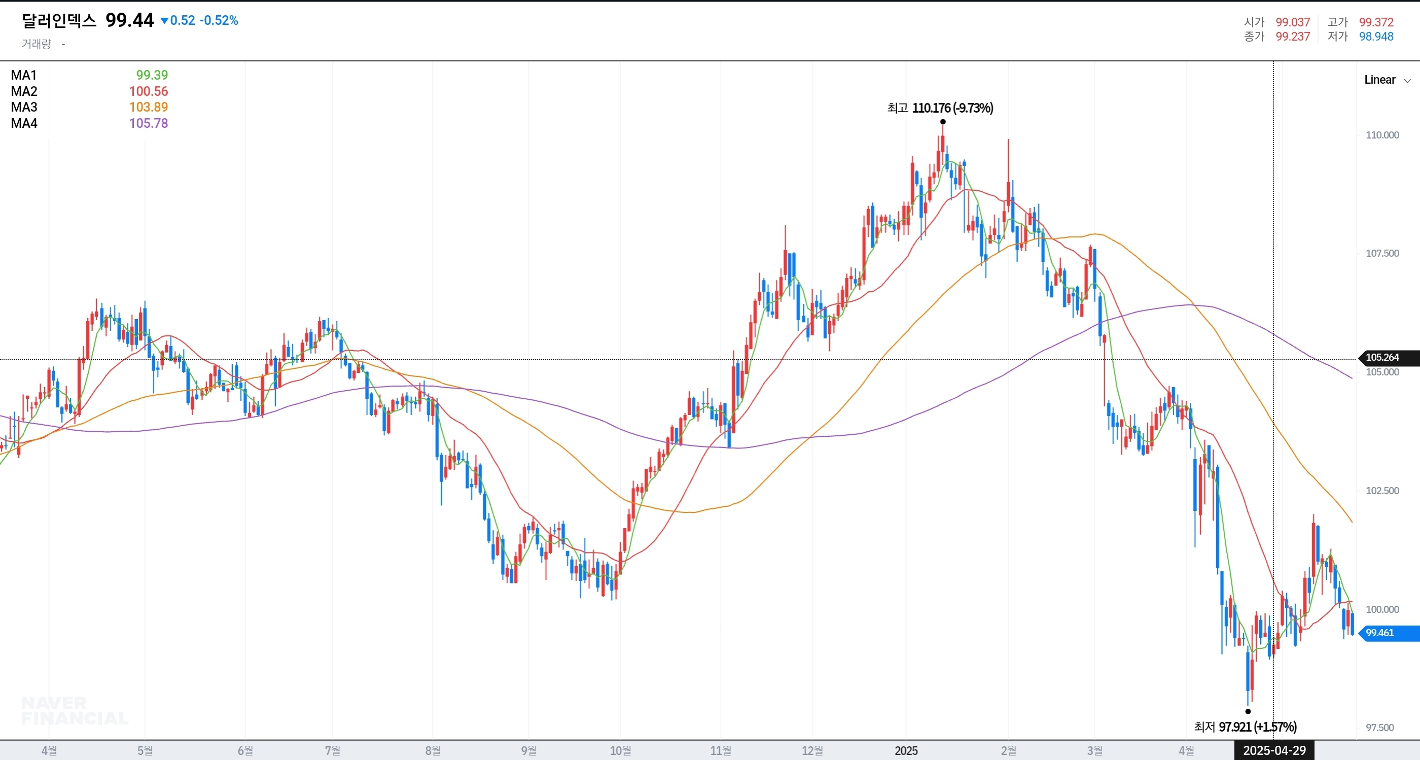 달러 인덱스는 올해 초에 비해 폭락하였고 ( 타 국가 통화 대비 달러의 약세 )