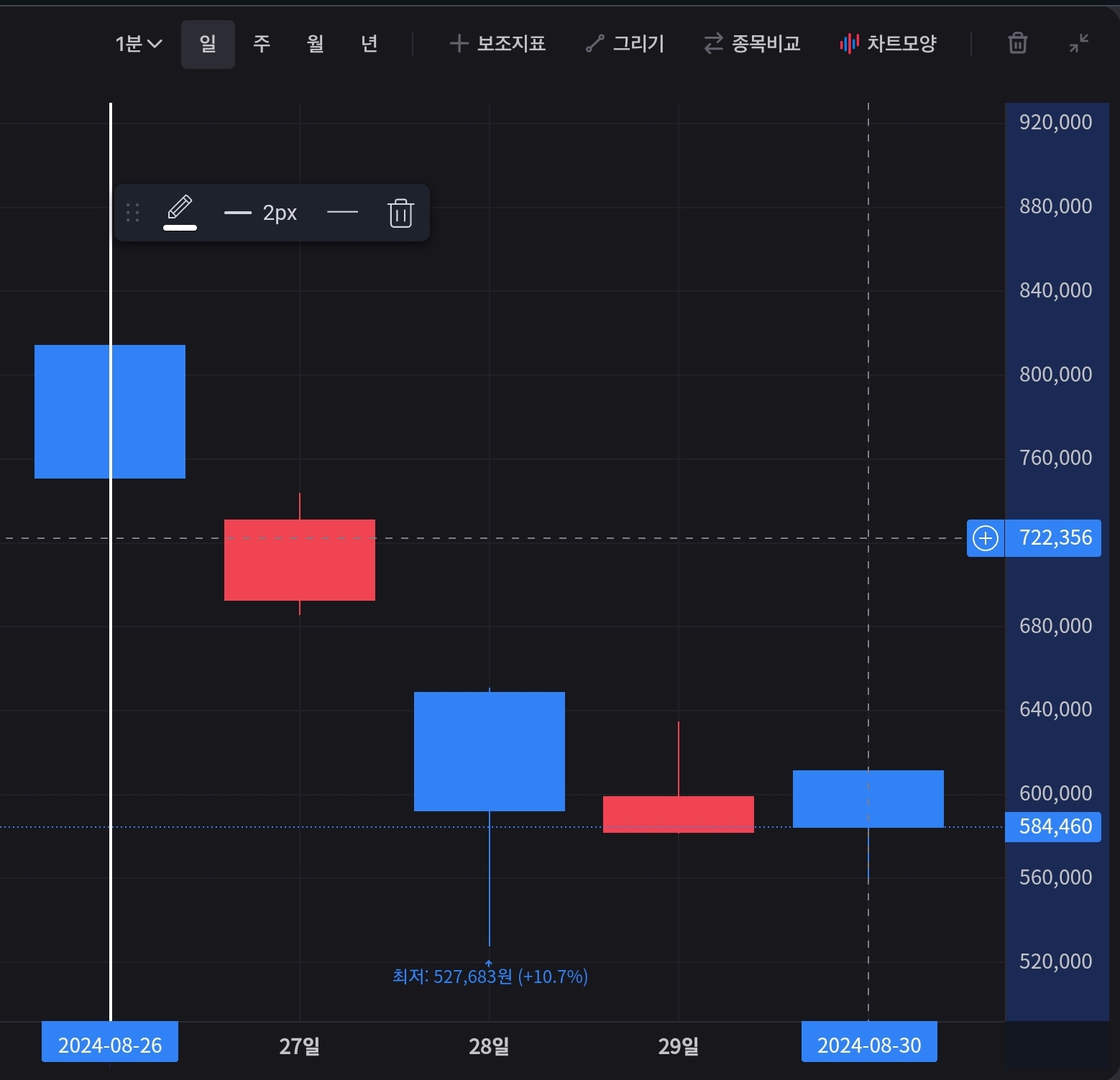 어마어마한 상승이죠. 다들 아시겠지만 AI 수혜주로써 가파르게 상승한 고점을 찍은 직후 다시 하락하고 있습니다.
