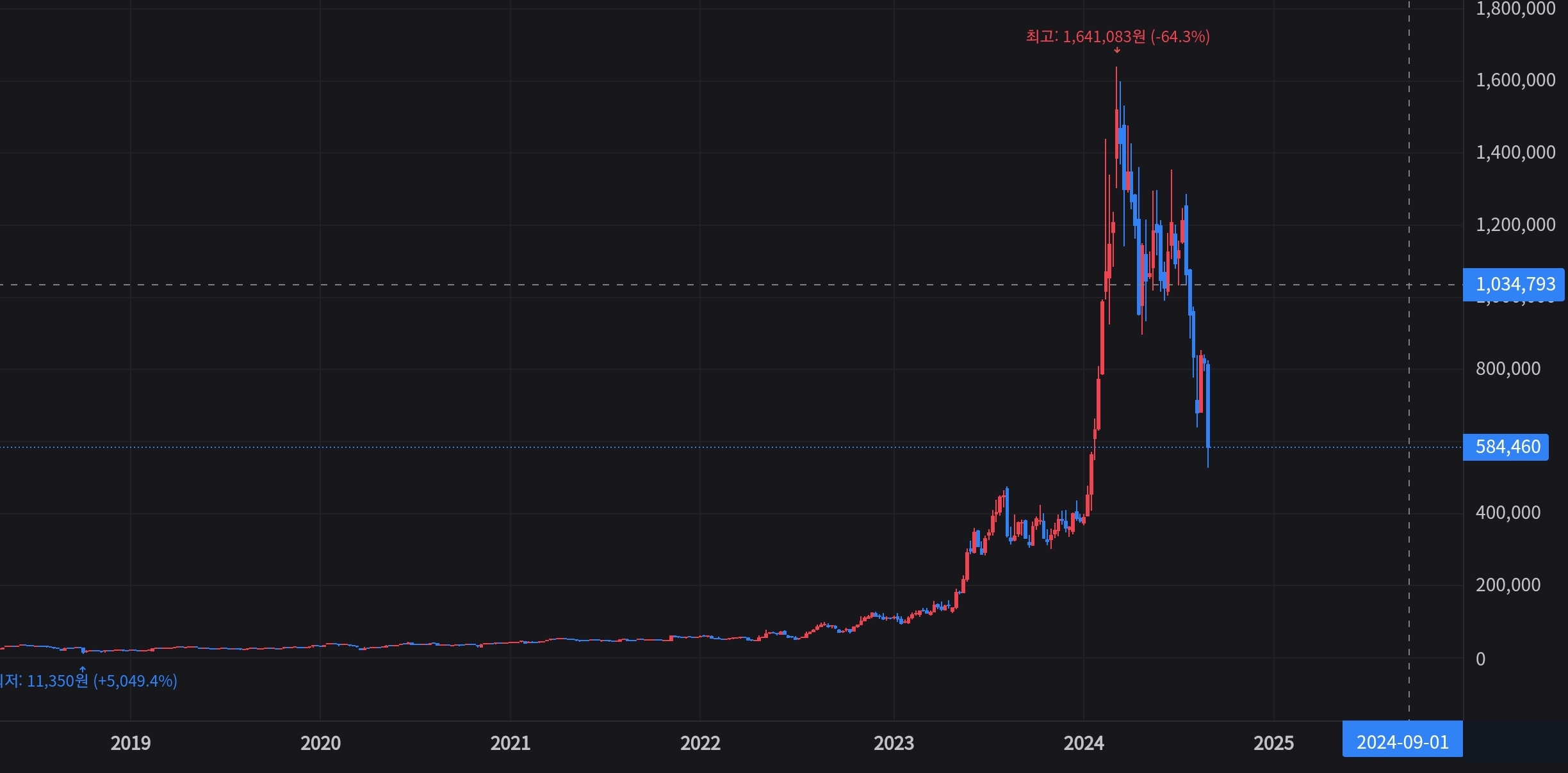 2018년 11,350원이였던 주가는 엔비디아 렐리에 힘입어 1,640,000원을 2024년 초에 찍습니다.