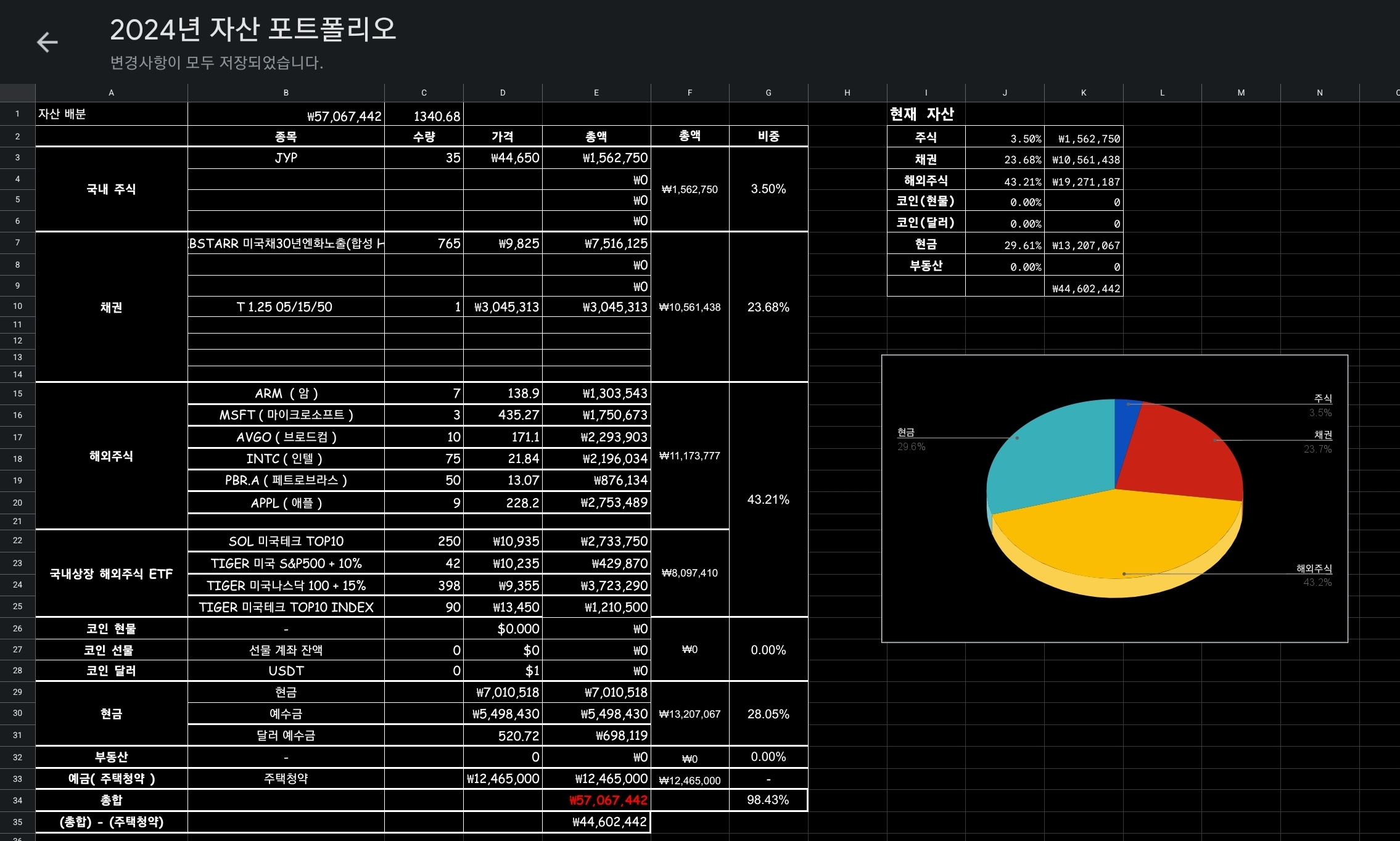 해외 주식 + 국내 주식의 비중이 46% 정도 되고 채권 24% , 현금 30% 정도 됩니다. 실제로는 연금 자산에 있는 현금들은 포함하지