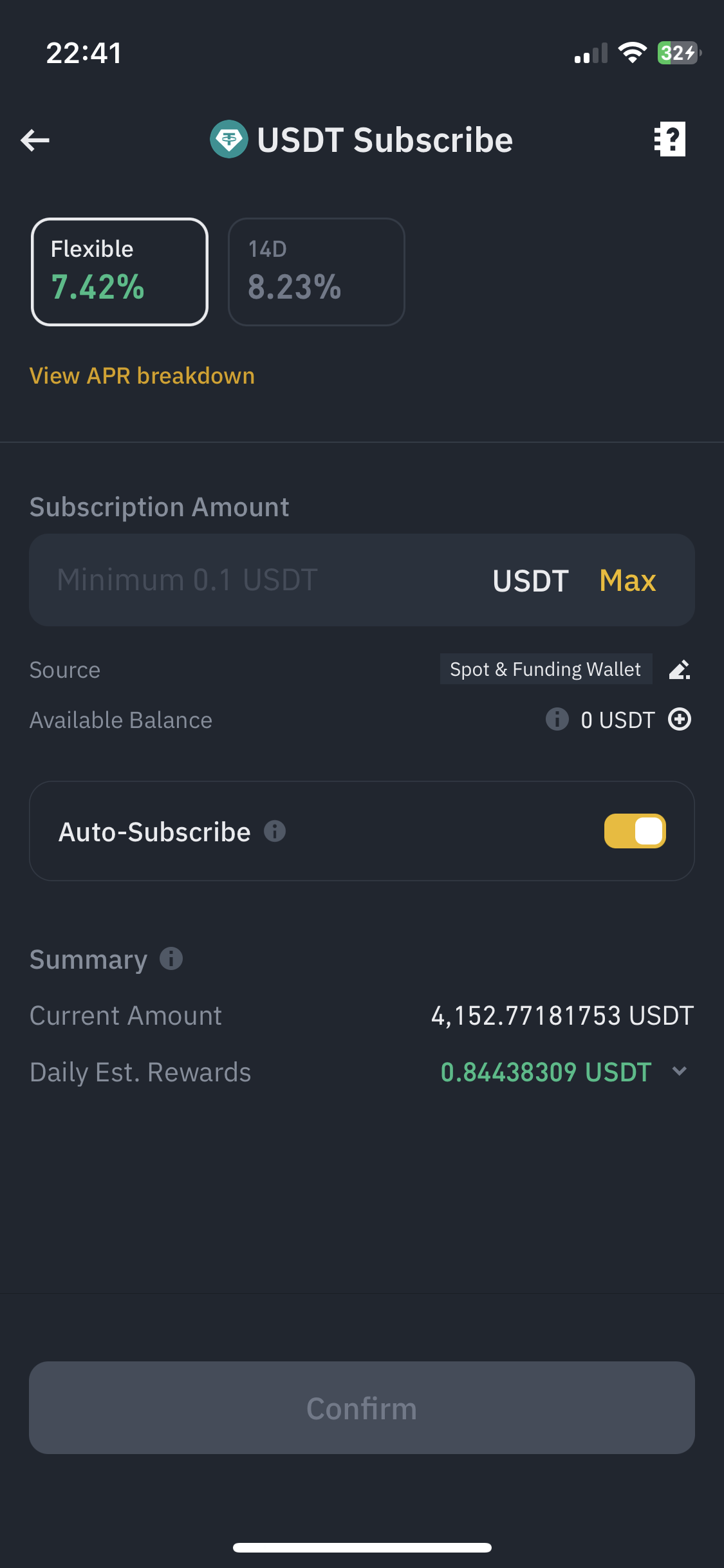 일단 이 돈은 일단 바이낸스 Earn에 예치해둘 예정입니다. 오늘 기준 연 7.4% 정도 이율이 나오네요.
