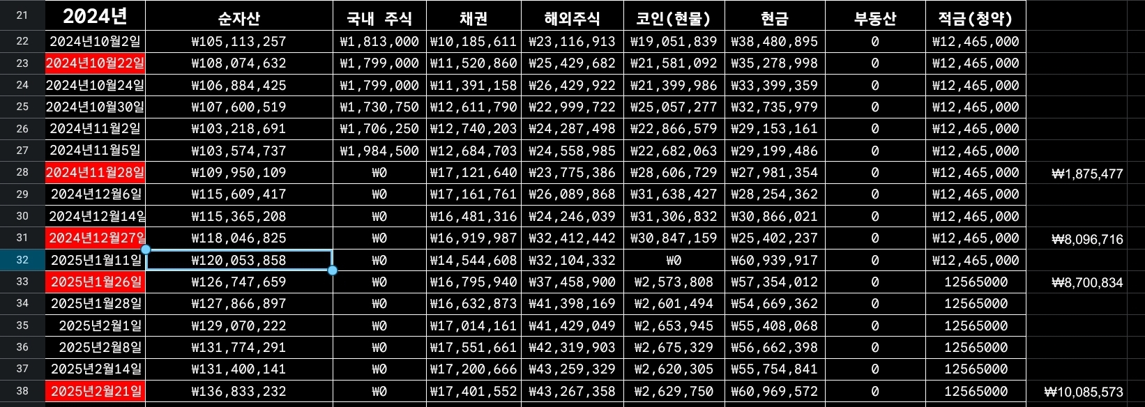 25년 이후 거의 한달에 800~1000 정도 씩 자산이 불어났습니다.