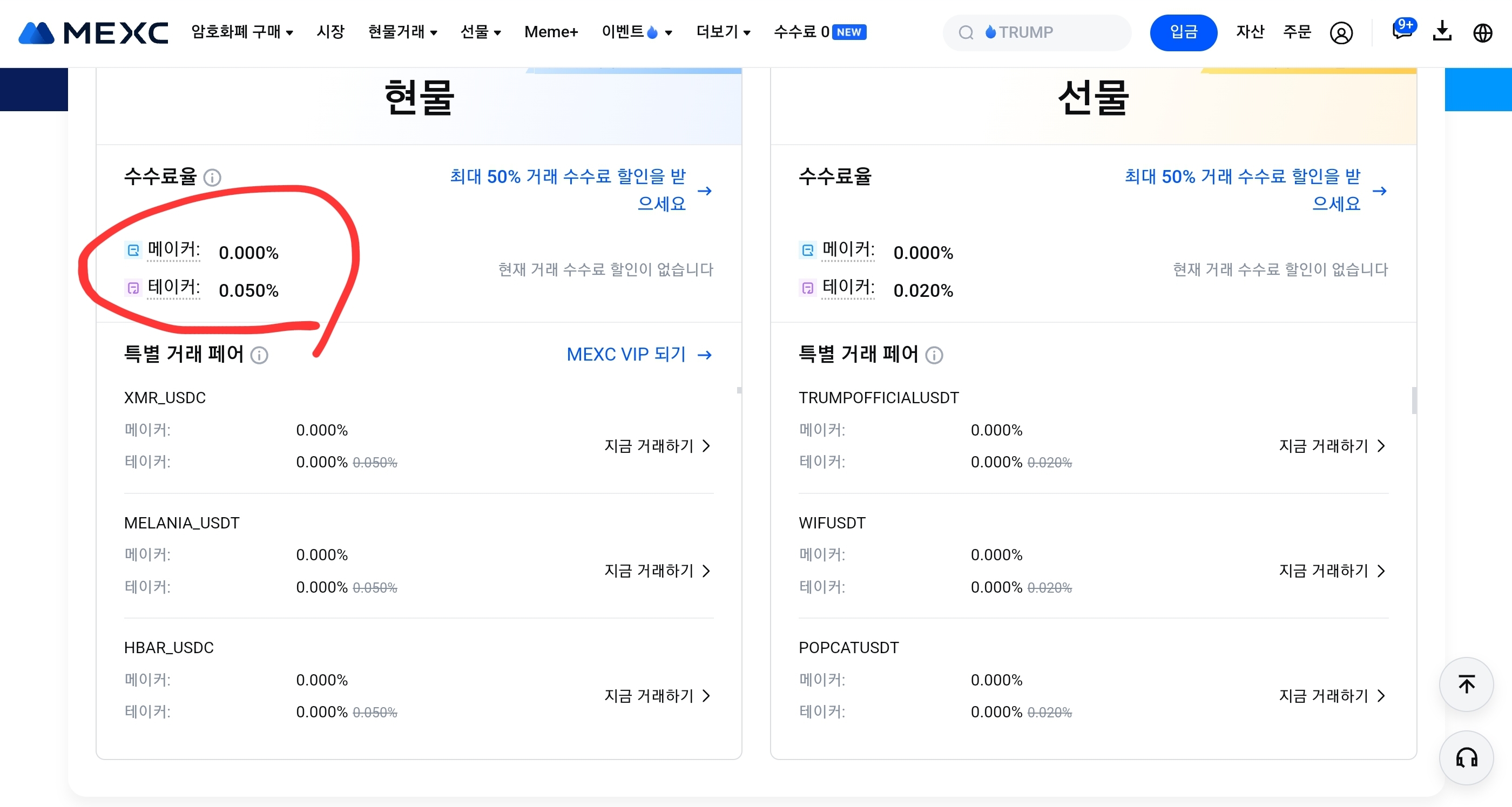 먼저 왼쪽 거래소였던 MEXC 거래소의 수수료는 아래와 같습니다.