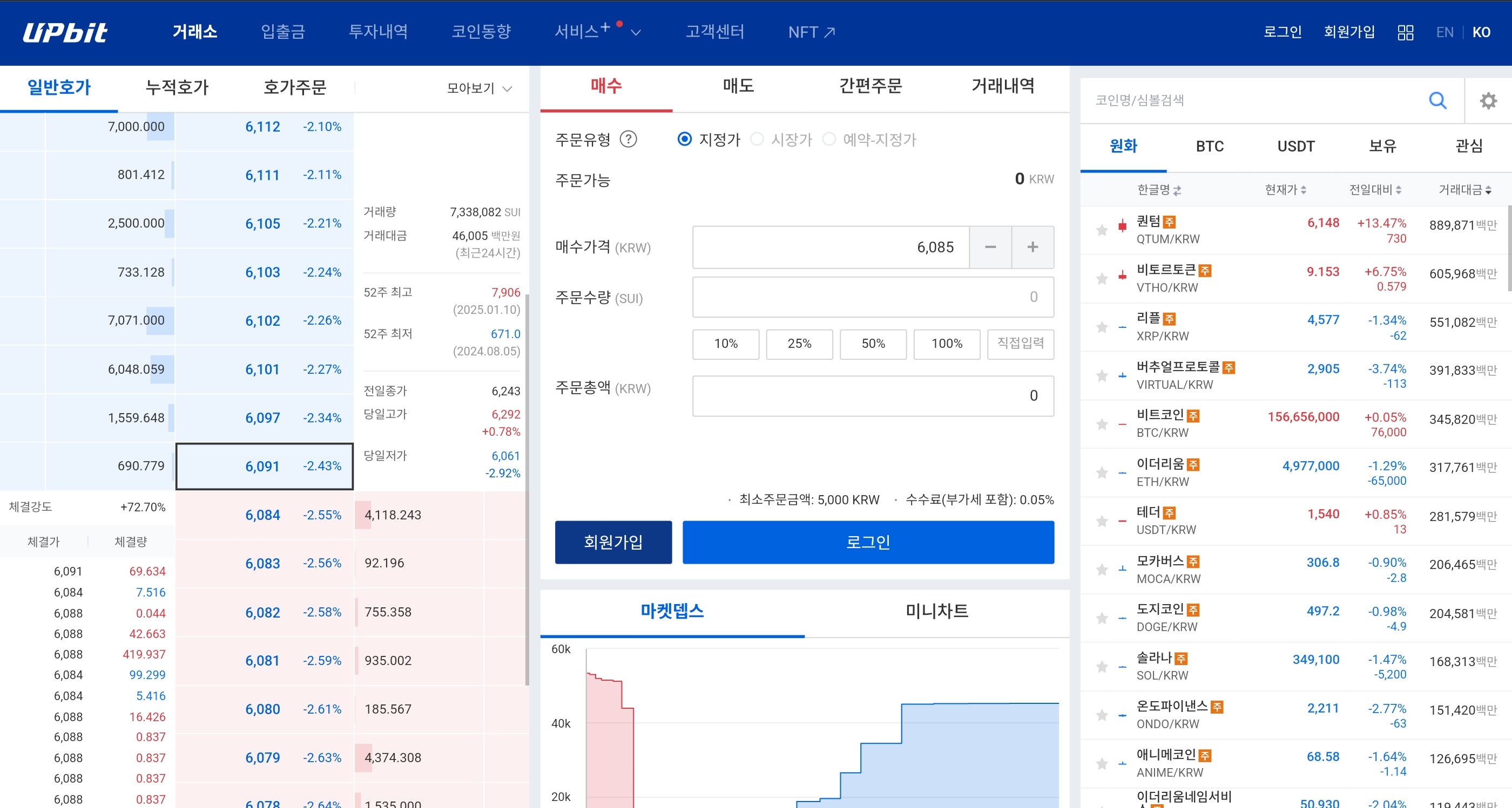 Upbit 거래소에서는 6,084원에 구매한다는 주문과 6,091원에 판매한다는 주문이 현재 최우선 호가를 차지 하고 있습니다.