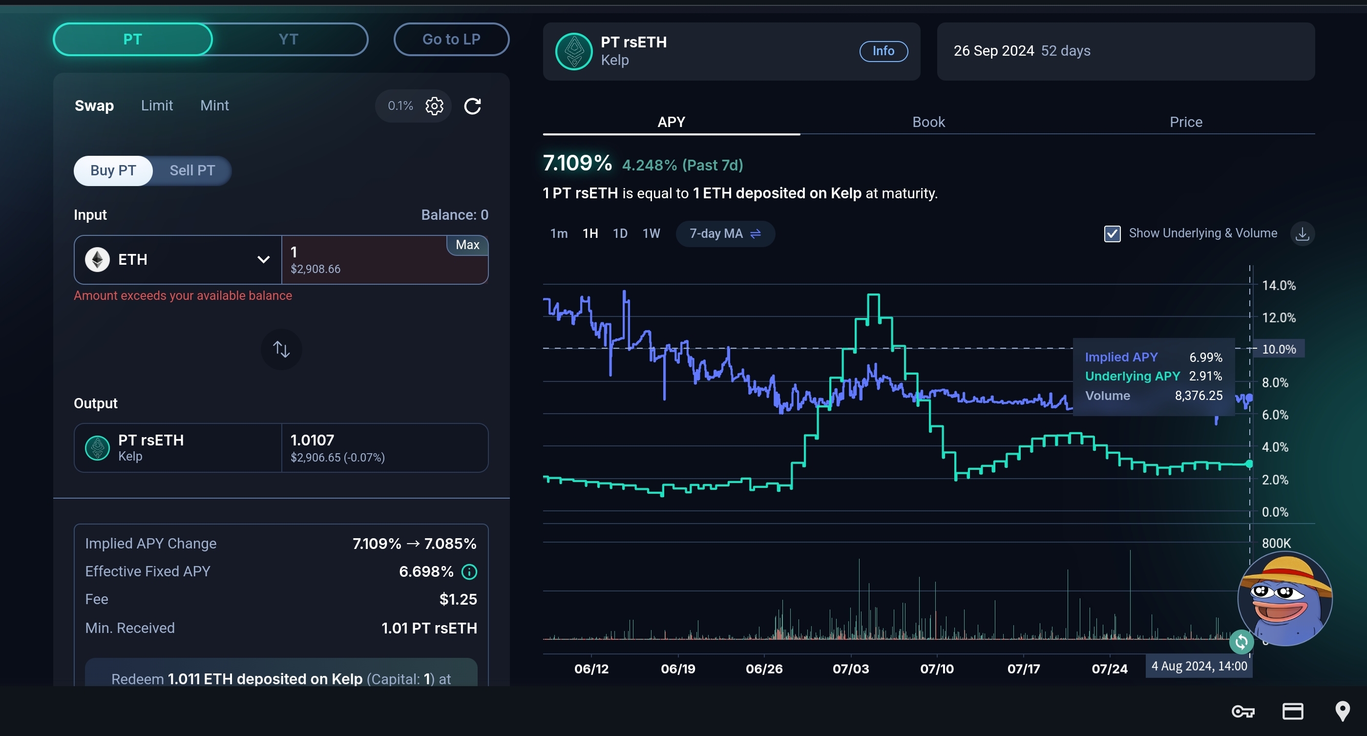 현재 PT-rsETH-26SEP2024의 이율은 7.11% 정도 이다. ( 위에 Pendle Finance 사진에 나와있듯이 )
