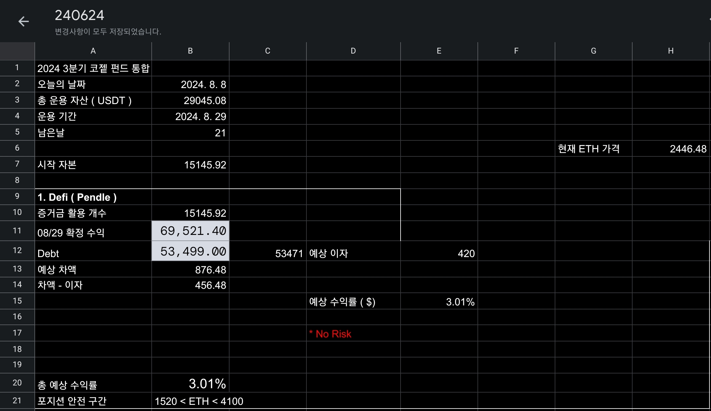 흠 일단 내돈 실제로 넣고 돌린 것이고 실제 LTV를 65% ~ 70% 정도로 잡고 보수적으로 만들어낸 포지션이기 때문에